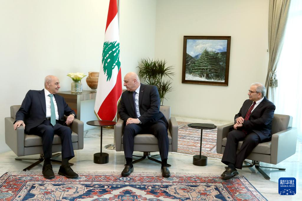 2月8日,在黎巴嫩贝鲁特,黎巴嫩总统约瑟夫·奥恩(中)、总理纳瓦夫·萨拉姆(右)和议长纳比·贝里(左)在新政府组建后会面。新华社发(比拉尔·贾维希 摄)