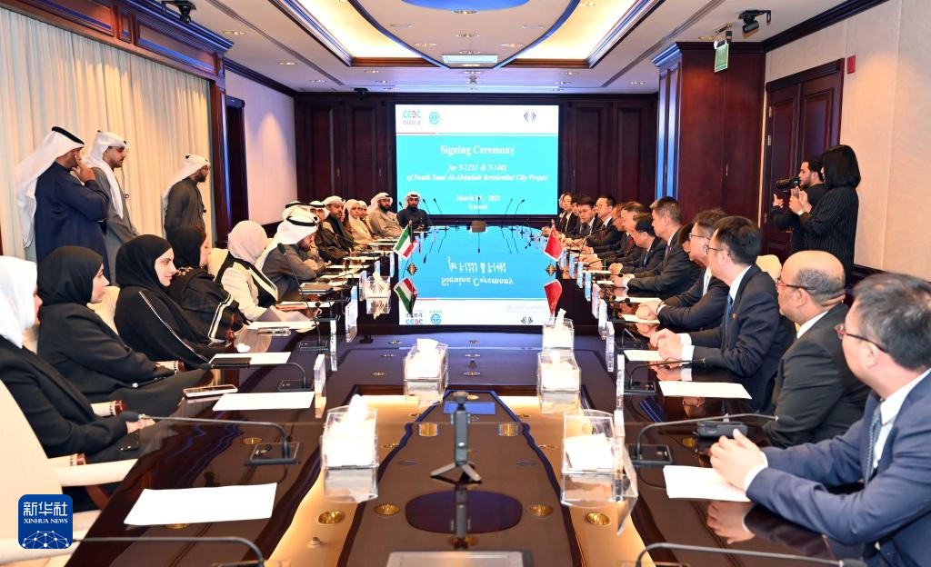 这是3月3日在科威特首都科威特城拍摄的中国能建葛洲坝集团与科威特住房福利总署的签约仪式现场。新华社发(阿萨德摄)