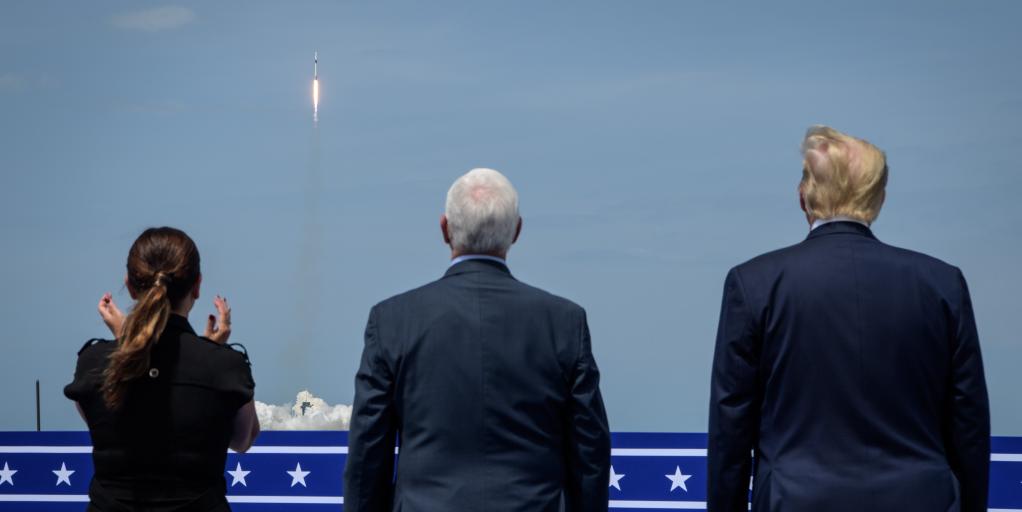 2020年5月30日,在肯尼迪航天中心,时任美国总统特朗普(右)和美国副总统彭斯(中)等观看载人版“龙”飞船搭乘“猎鹰9”火箭升空。新华社发(美国国家航空航天局供图)