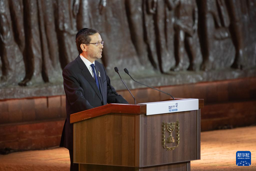 4月23日,以色列总统赫尔佐格在耶路撒冷举行的大屠杀纪念日活动上致辞。