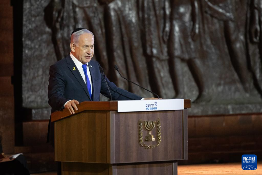 4月23日,以色列总理内塔尼亚胡在耶路撒冷举行的大屠杀纪念日活动上致辞。