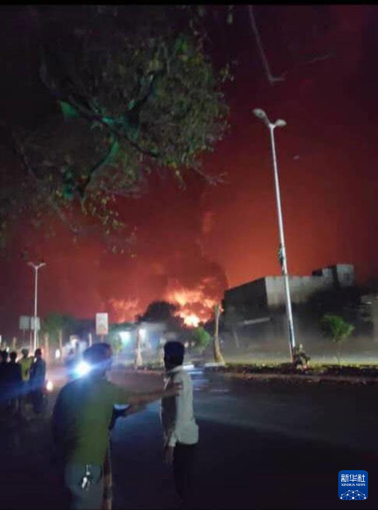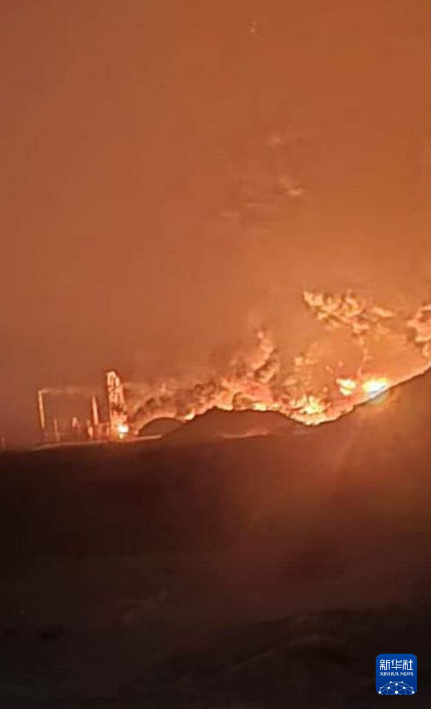 5月5日,在也门荷台达省东部巴吉勒区,一家水泥厂遭到空袭后燃起大火(视频截图)。新华社发