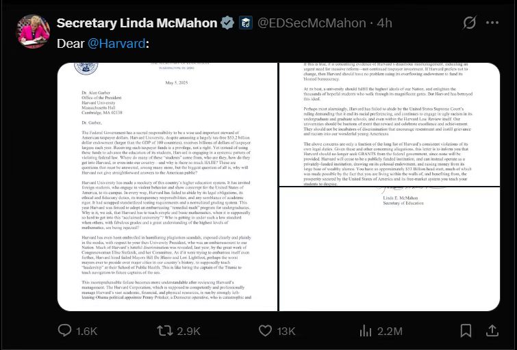 美国教育部长琳达·麦克马洪5日晚在社交媒体平台X上发布一封写给哈佛大学校长艾伦·M·加伯的信。她在信中说,哈佛大学“系统性”违反联邦法律,“嘲弄”了美国高等教育体系。她指责哈佛大学被左派人士运营,成为“一个党派的政治倡导组织”。