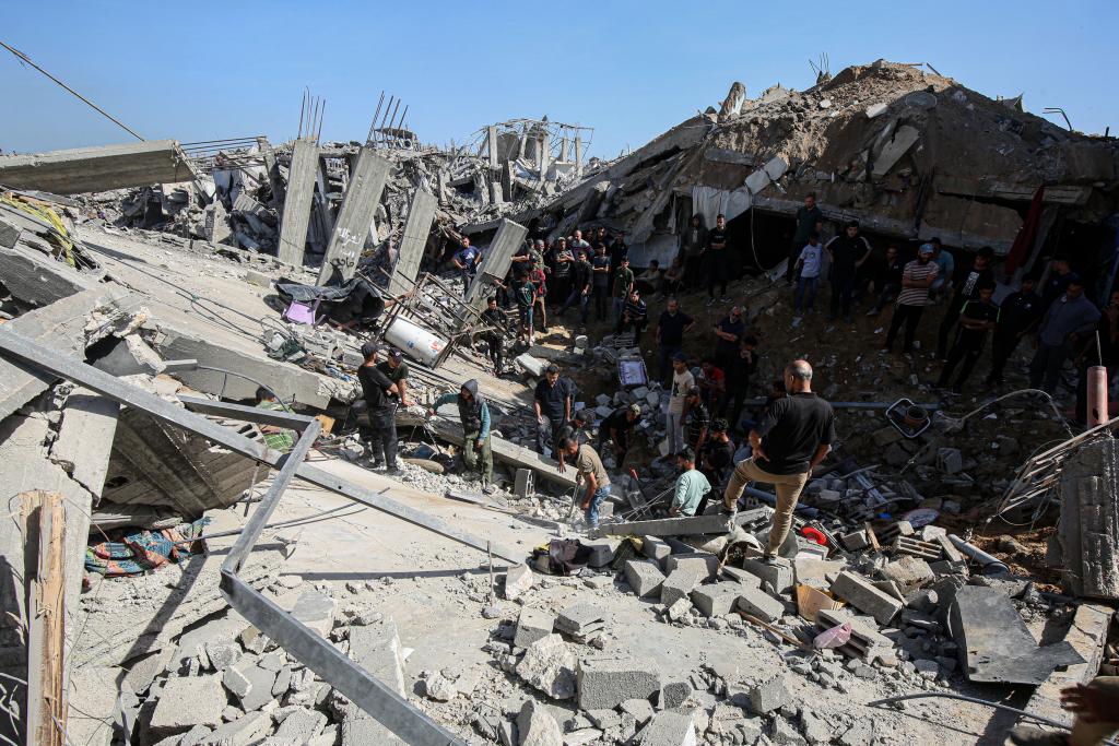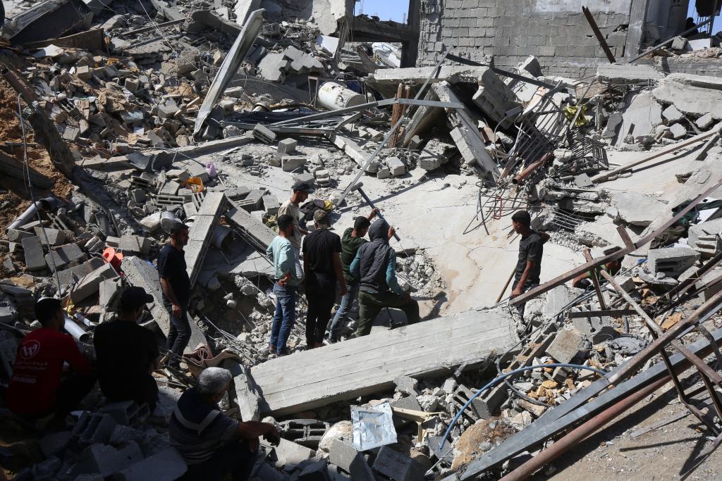 5月16日,在加沙地带北部杰巴利耶难民营,人们查看以军袭击后的建筑废墟。新华社发(里泽克·阿卜杜勒贾瓦德摄)