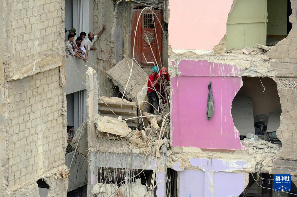 7月4日,在巴基斯坦南部港口城市卡拉奇,救援人员在住宅楼废墟中开展搜救工作。新华社发