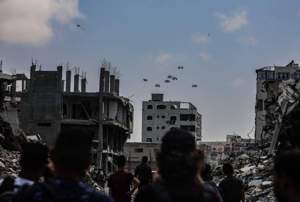 8月8日,飞机在加沙城上空空投物资。新华社发(里泽克·阿卜杜勒贾瓦德摄)