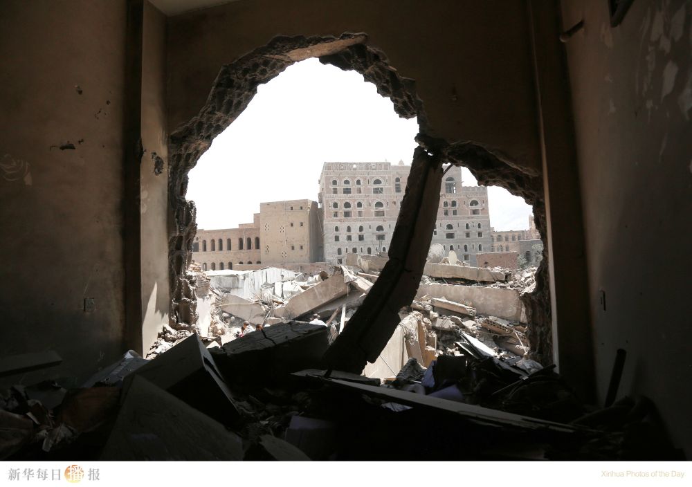 这是9月13日在也门首都萨那拍摄的遭以军空袭损毁的建筑。