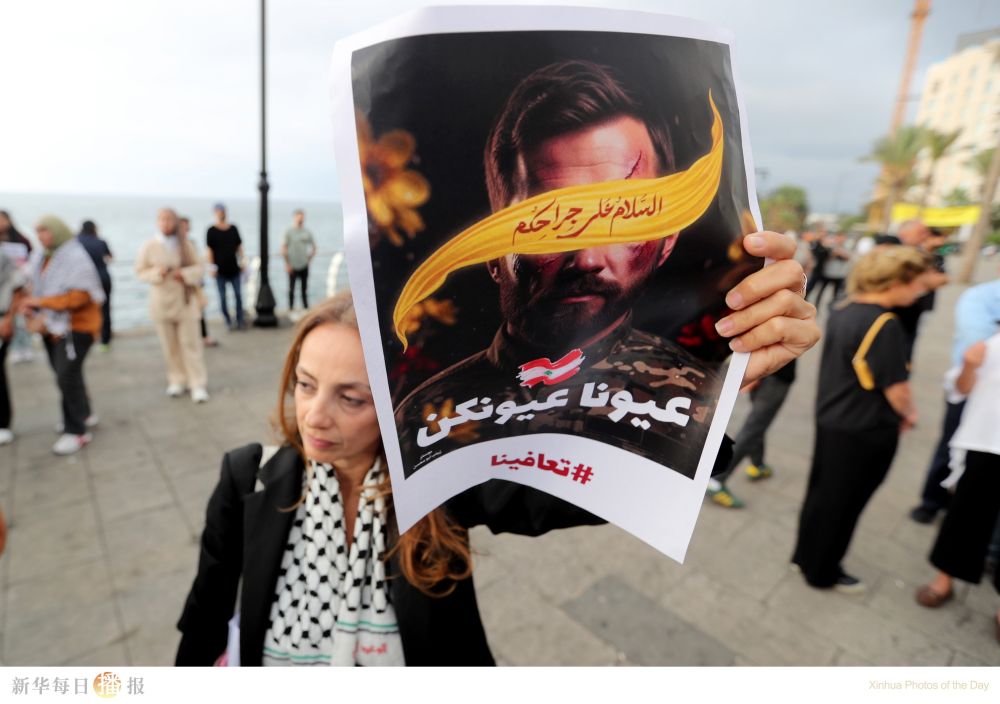 9月17日,一名女子在黎巴嫩贝鲁特手持标语牌声援通信设备爆炸事件的受害者。