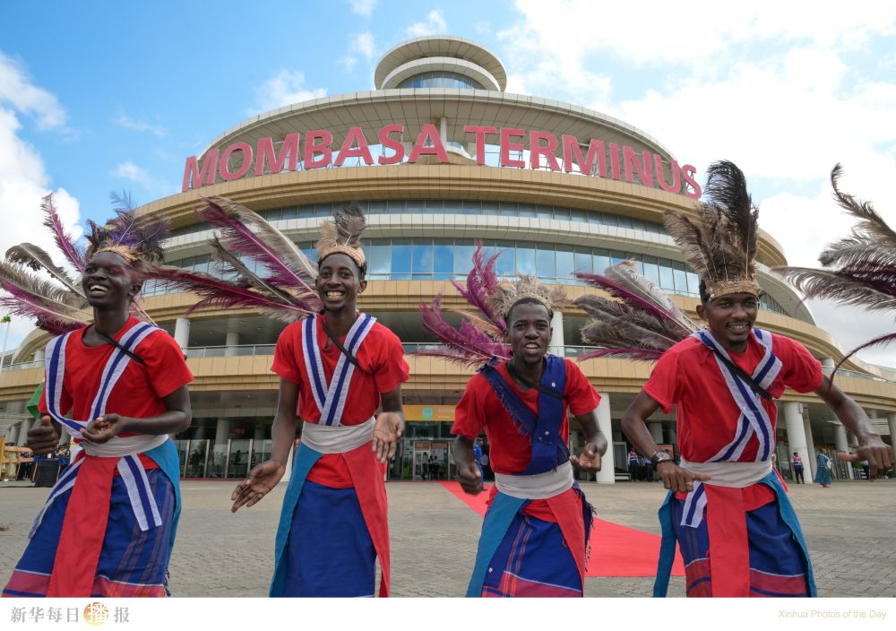 9月17日,在蒙内铁路蒙巴萨终点站,身穿传统民族服装的演员跳舞庆祝蒙巴萨通勤米轨修复项目完工。