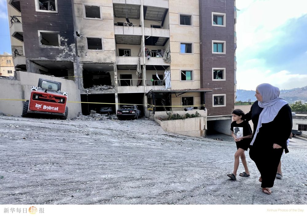 9月16日,在黎巴嫩奈拜提耶,一名妇女带着孩子从遭以军袭击后的建筑前走过。