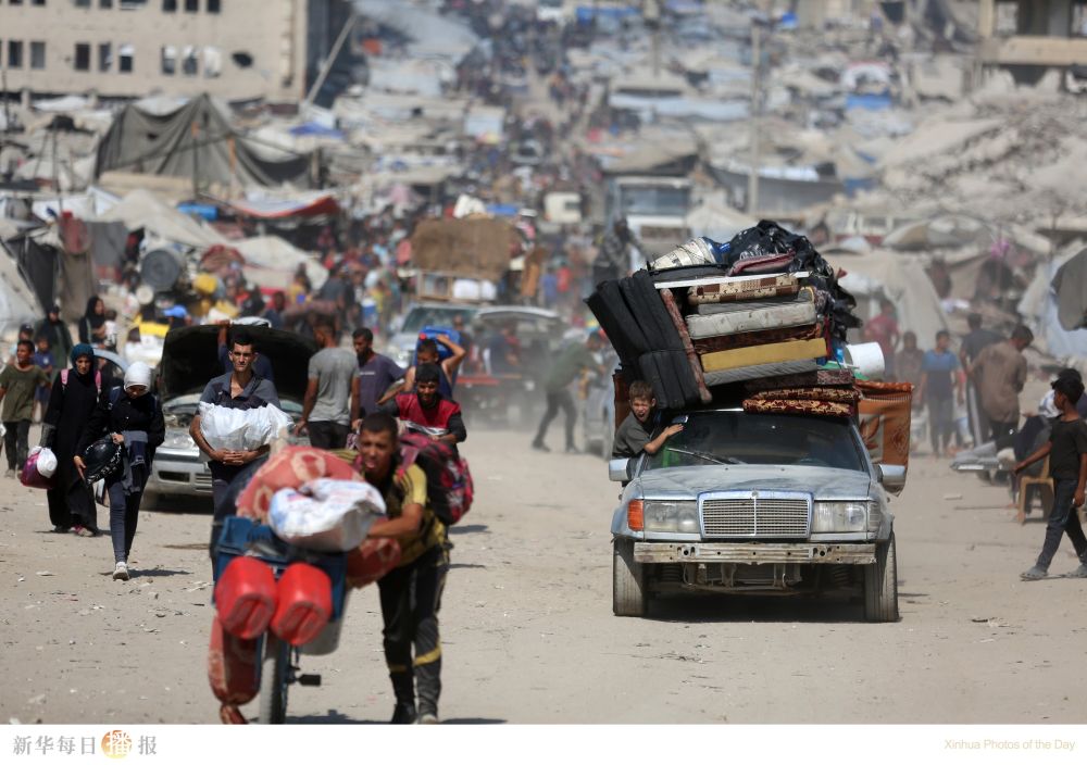 9月18日,在加沙城以西的沿海公路上,人们运载着生活用品,汇入人潮向南撤离。