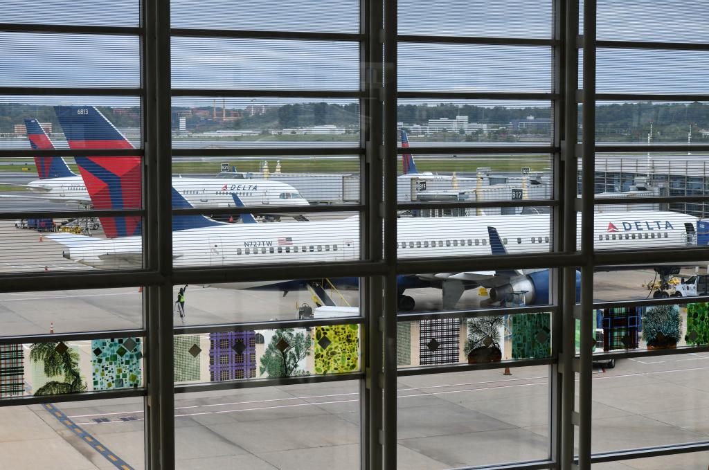 10月10日,飞机停靠在美国弗吉尼亚州阿灵顿的里根国家机场。新华社记者李睿摄
