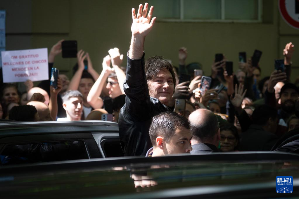 10月26日,阿根廷总统米莱(中)在布宜诺斯艾利斯一处投票点外向选民挥手致意。