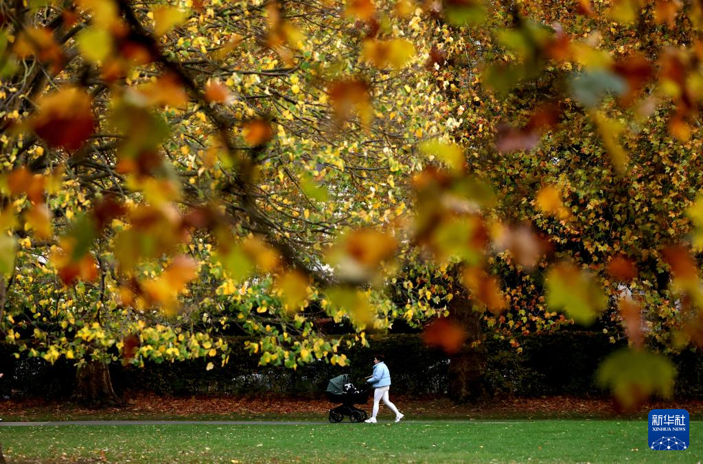 10月27日,一名女子手推婴儿车走在英国伦敦摄政公园。