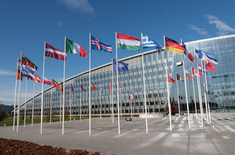 11月5日,在比利时首都布鲁塞尔,北约及成员国旗帜飘扬在北约总部外。 新华社记者 张兆卿 摄