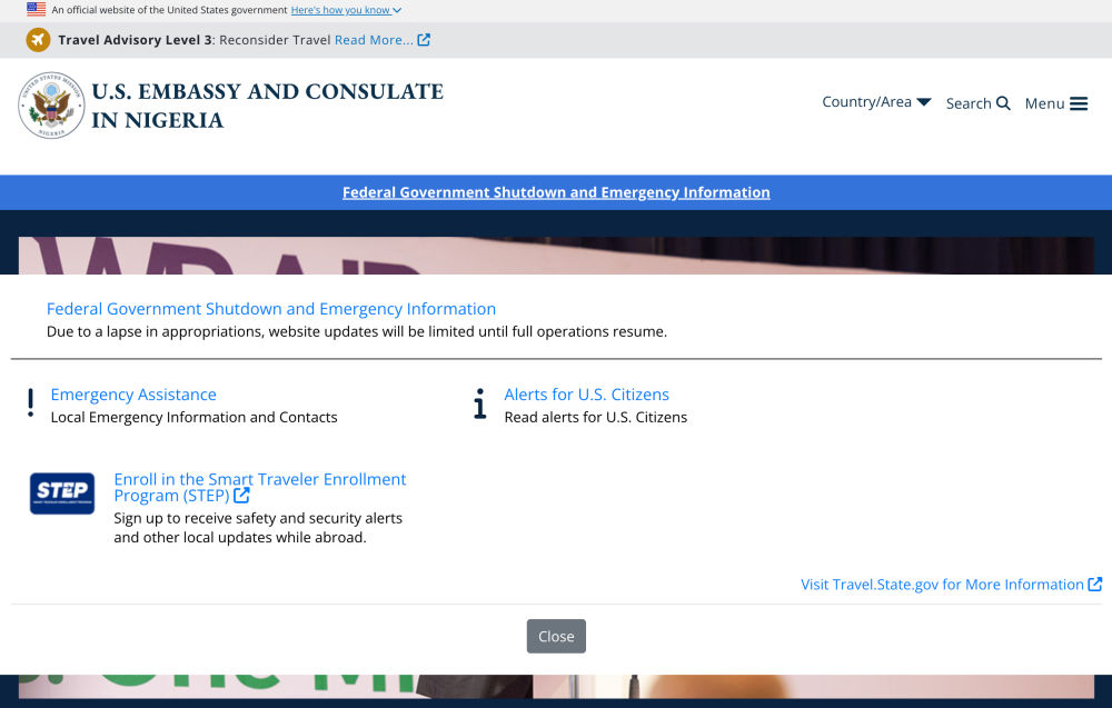 11月5日,打开美国驻尼日利亚大使馆网站,弹窗提示依然是:因受美国联邦政府“停摆”拨款中断影响,网站的更新将受到限制。