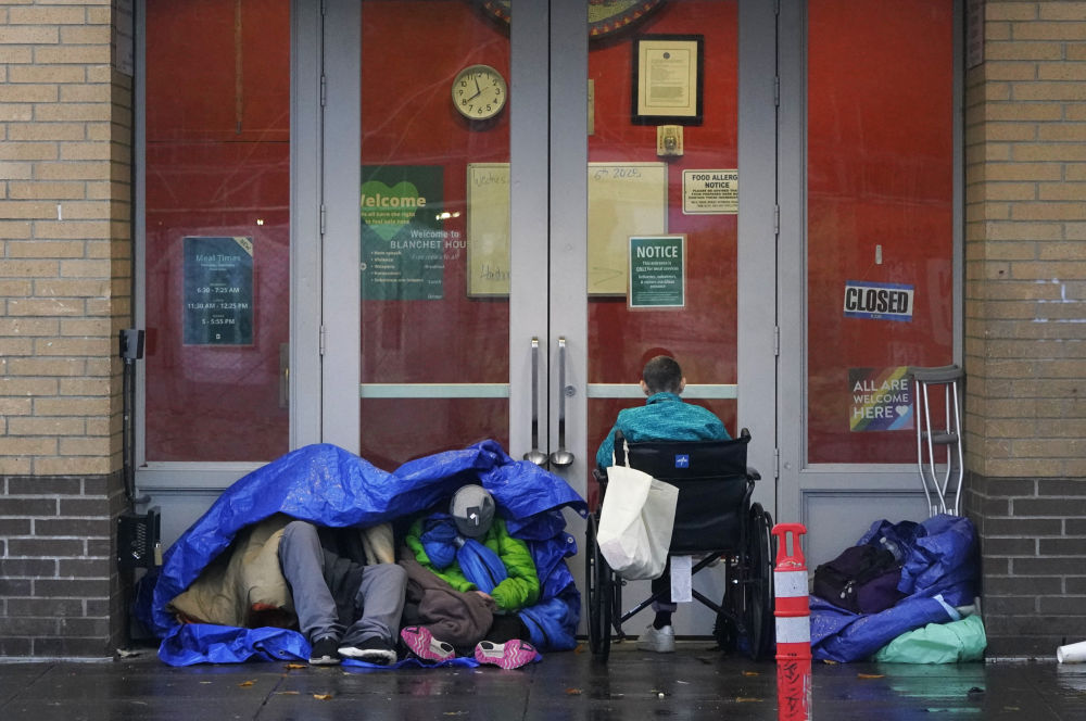 11月5日清晨,在美国波特兰的深秋寒意中,无家可归者蜷缩在街边角落里。 新华社记者 吴晓凌 摄