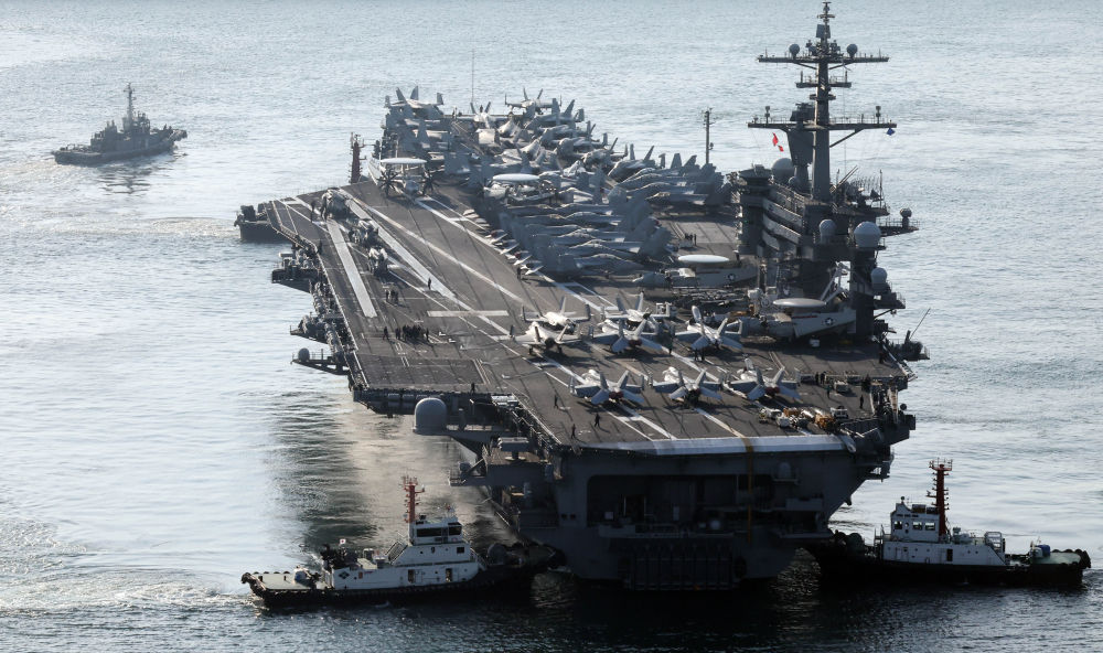 11月5日,美国核动力航母“乔治·华盛顿”号抵达韩国釜山港。 新华社/纽西斯通讯社