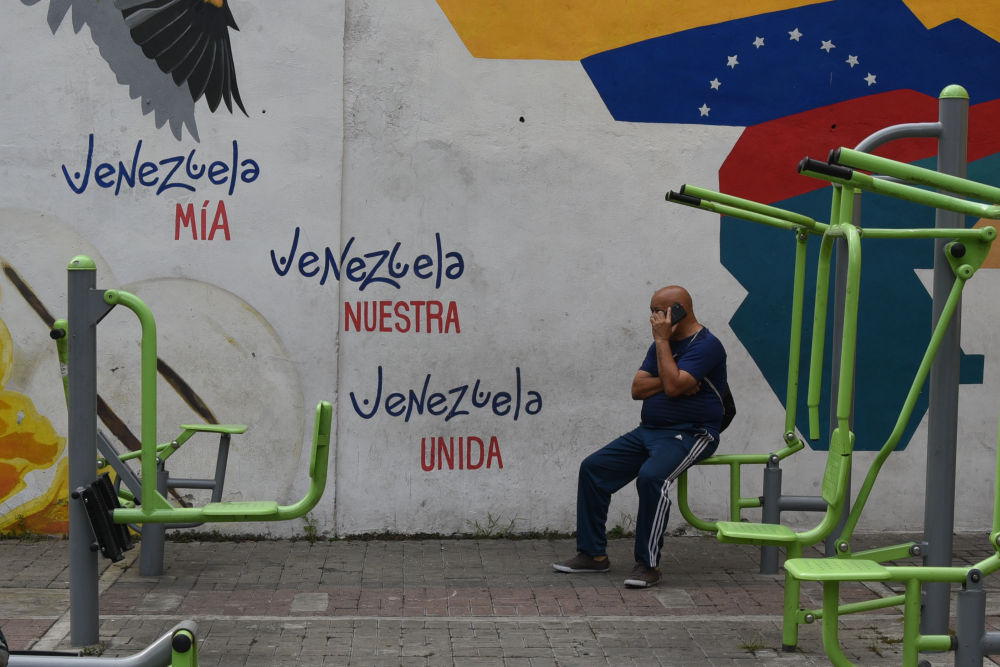 11月5日,在委内瑞拉首都加拉加斯,一名男子坐在号召团结的宣传画前。标语上写着“我的委内瑞拉 我们的委内瑞拉 团结的委内瑞拉”。 新华社发(萨尔加多摄)
