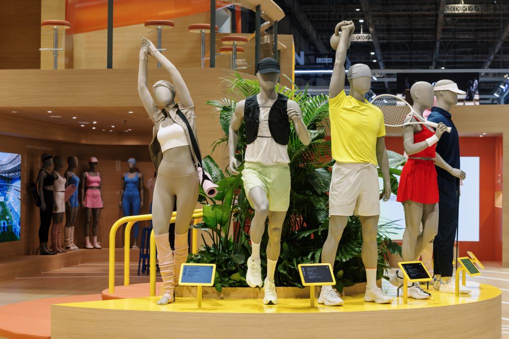 露露乐蒙展台以“好状态趣动场”为主题,展示品牌在瑜伽、跑步、训练、网球、高尔夫和日常出行六大品类的明星产品。受访者供图