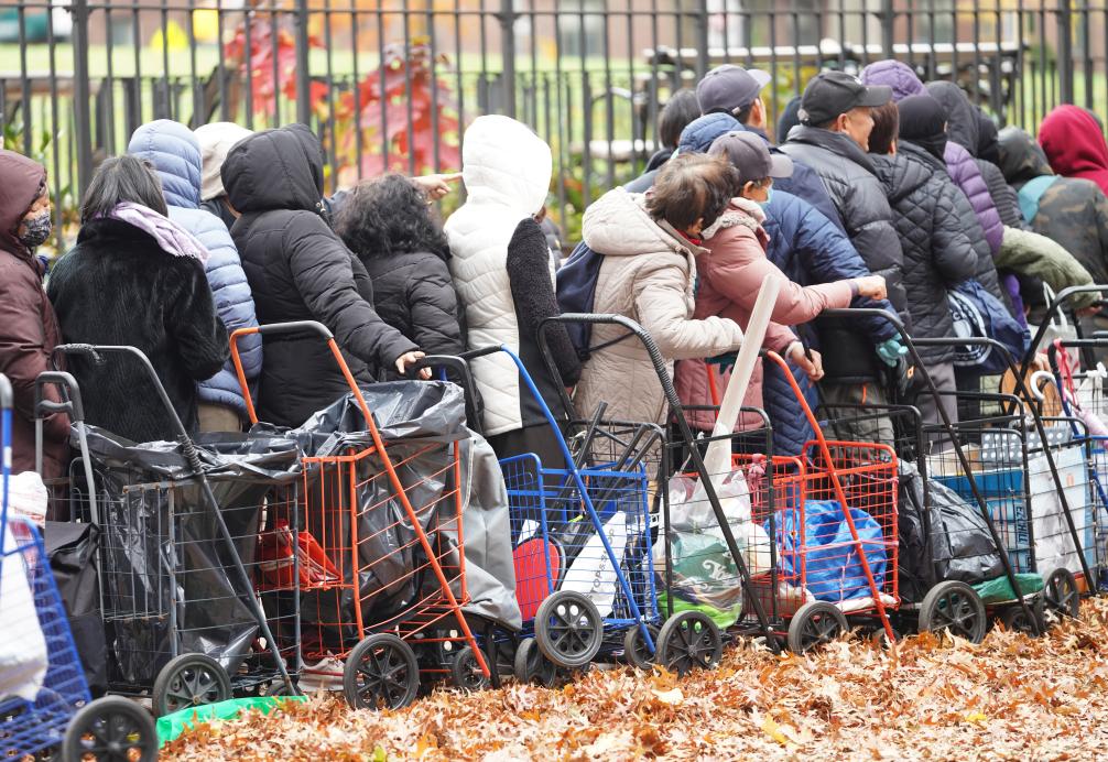 11月12日,人们在美国纽约一处食物发放点领取食物。新华社记者张凤国摄
