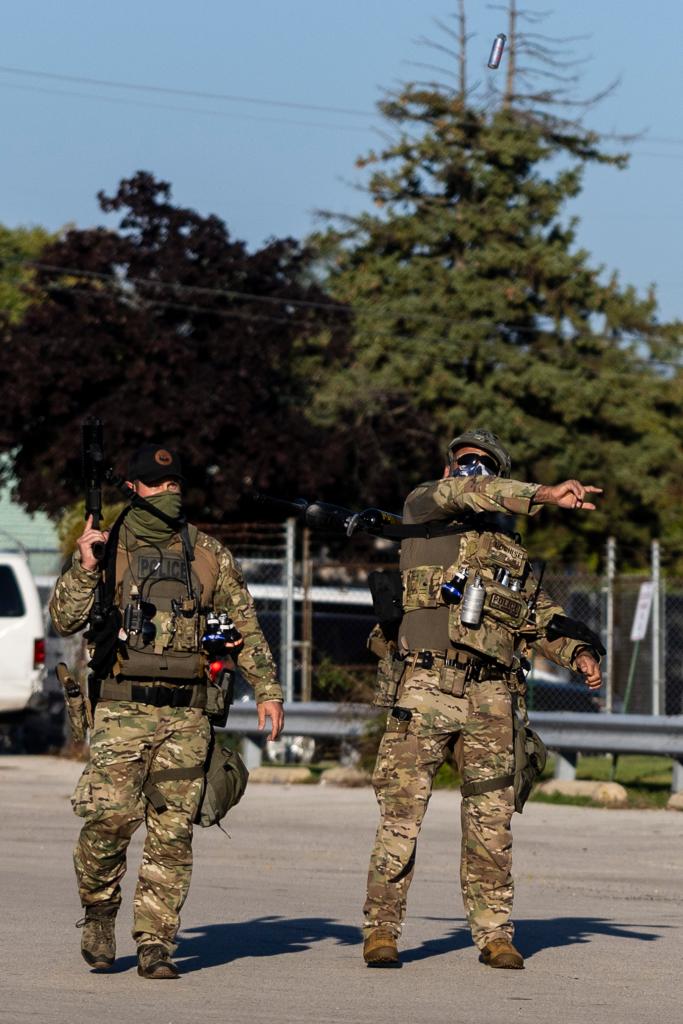 9月26日,在位于美国芝加哥西郊布罗德维尤市的移民与海关执法局办事机构,执法人员向抗议者投掷催泪弹。新华社发(文森特·约翰逊摄)
