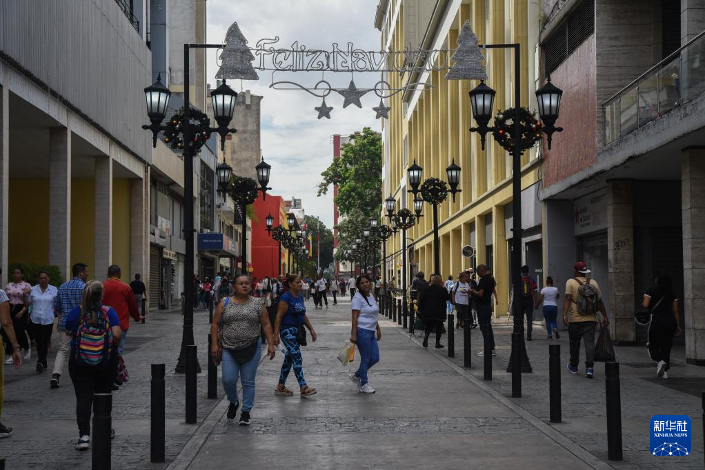 11月17日,人们走在委内瑞拉首都加拉加斯一条布置着圣诞装饰的街道上。新华社发(马科斯·萨尔加多摄)
