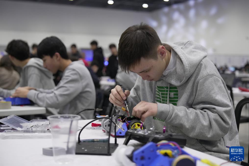2月11日,在哈萨克斯坦首都阿斯塔纳,青少年在科技节上参加机器人维修比赛。