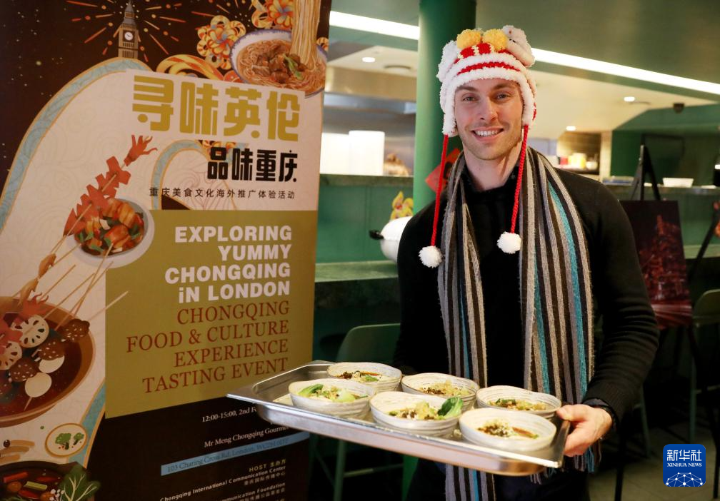 2月2日,一名食客在英国伦敦举行的“寻味英伦 品味重庆”活动现场展示重庆小面。作为英国“欢乐春节”系列活动之一,此次活动不仅吸引了英国食客,也聚集了一批乐于体验中国美食文化、讲述中国美食故事的英国社交媒体达人。