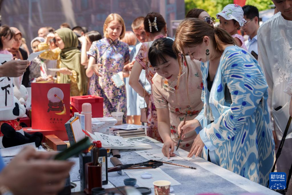 5月27日,人们在乌兹别克斯坦首都塔什干的中央公园体验中国书法。