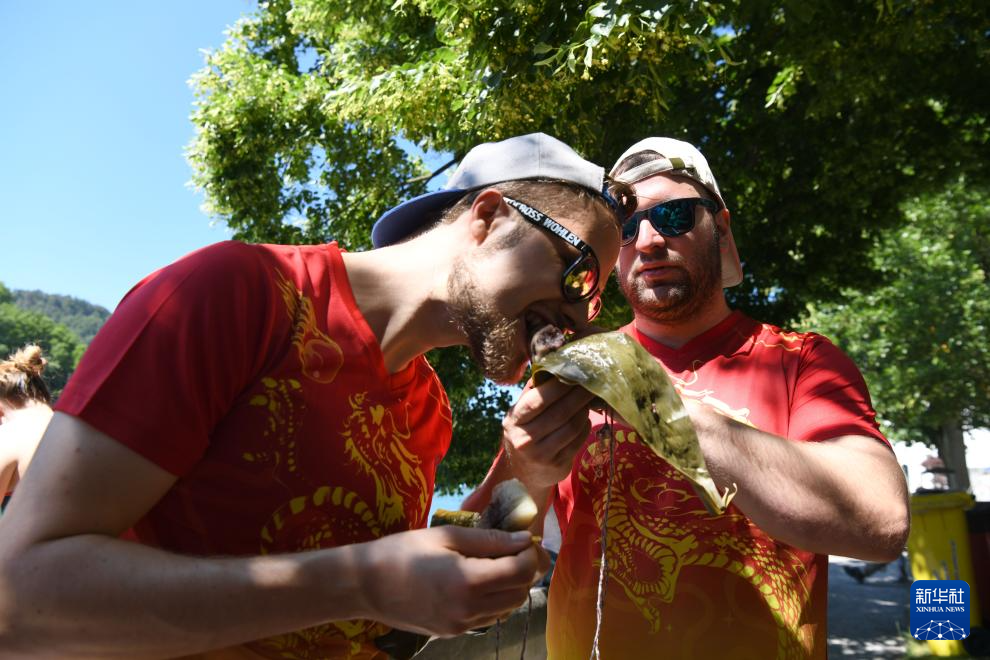 6月25日,人们在瑞士埃格利绍举行的第31届埃格利绍国际龙舟赛上品尝中国粽子。