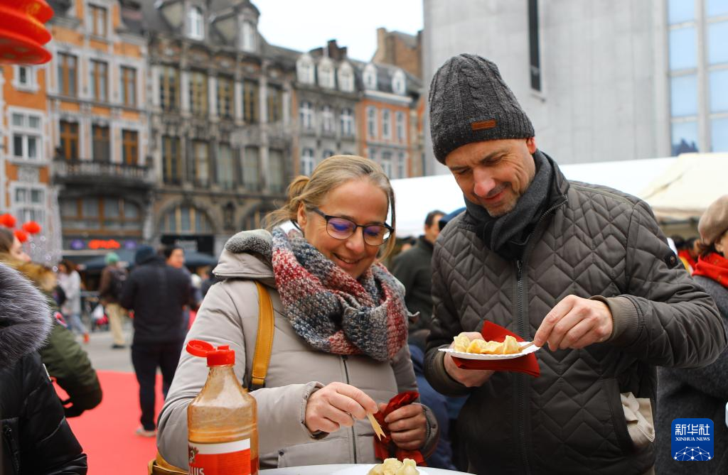 1月28日,人们在比利时纳慕尔举行的“中国春节游园庙会”活动上品尝饺子。