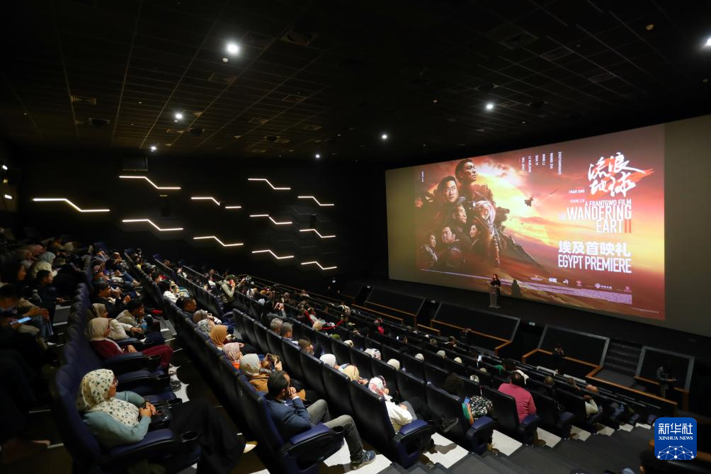 3月11日,人们在埃及吉萨一家电影院参加电影《流浪地球2》的首映礼。