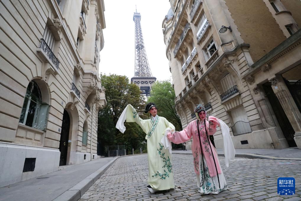 9月13日,江苏省演艺集团昆剧院院长施夏明(左)和江苏省演艺集团昆剧院国家一级演员孔爱萍在法国巴黎埃菲尔铁塔附近参加昆曲快闪。