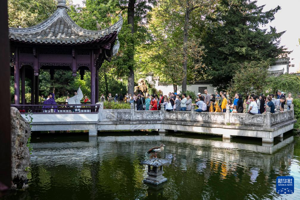 9月30日,人们在德国法兰克福“春华园”中观看中国舞表演。