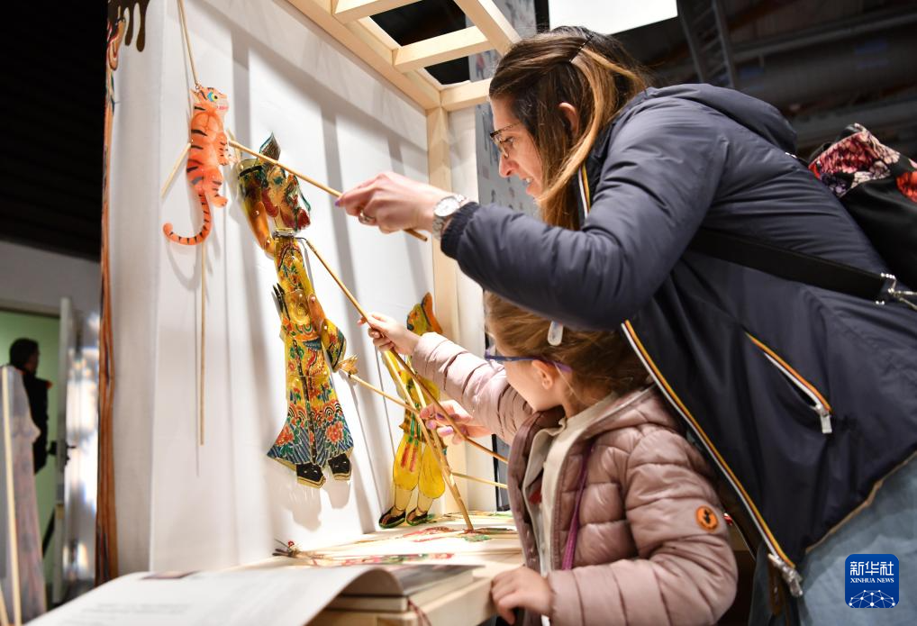 4月25日,在意大利佛罗伦萨举办的国际手工艺展览会上,参观者体验中国皮影文化。