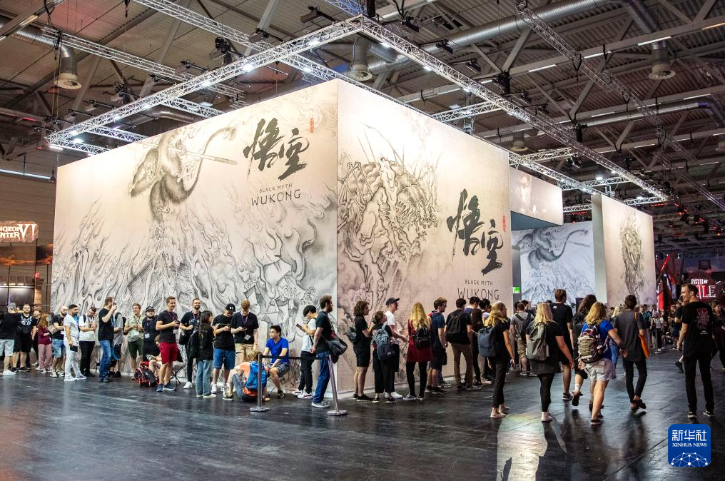 8月23日,玩家在德国科隆游戏展的游戏科学展台前排队试玩游戏。中国企业首次大规模独立参加全球游戏行业盛会科隆国际游戏展,成为展会一大亮点。