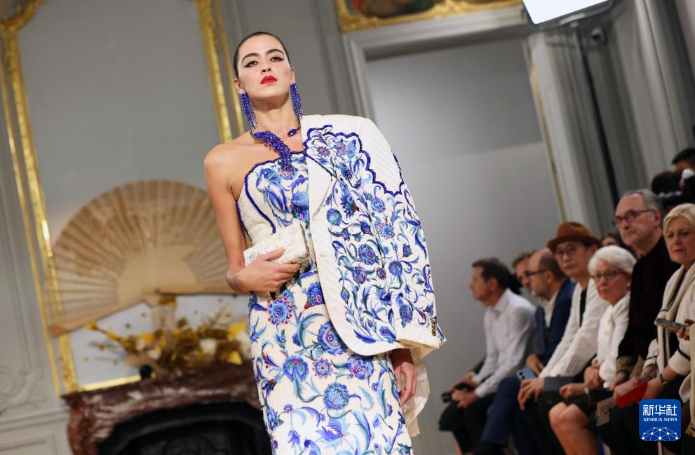 9月27日,模特在法国巴黎中国文化中心举办的“恭王府服饰秀”上展示设计师劳伦斯·许创作的恭王府系列高定服装。