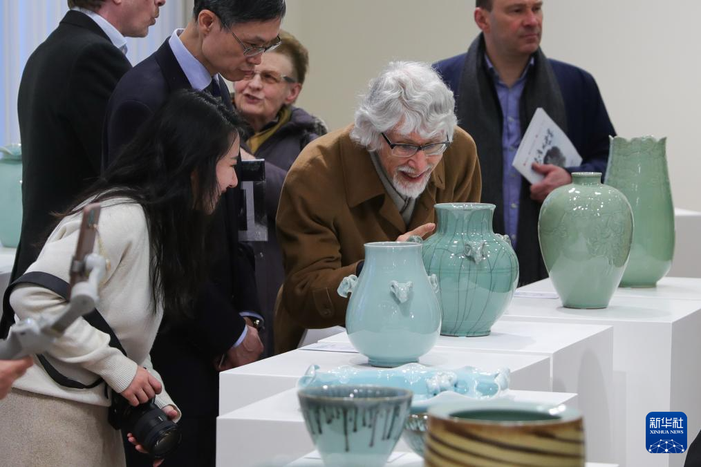 4月3日,在比利时布鲁塞尔,参观者在“听瓷语 观世界——宋韵龙泉青瓷展”上观赏瓷器。本次展览展出的55件青瓷作品均由龙泉市当代艺术家、手工艺人设计烧制,包括摹古经典器物、艺术青瓷、现代日用青瓷等,既展示了中国工匠对青瓷技艺的传承与发展,也传递出中国文化中的审美情趣和向往追求。