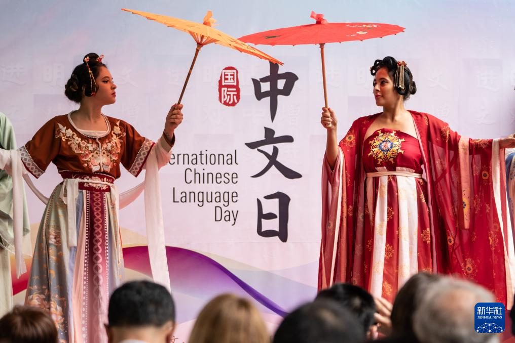 4月19日,表演者在巴西里约热内卢的中文日活动上展示汉服。当日,在巴西里约热内卢举办的联合国中文日活动上,观众欣赏汉服、武术和茶艺等表演,体验了解中国书法、中国美食、中文课程和中医文化。