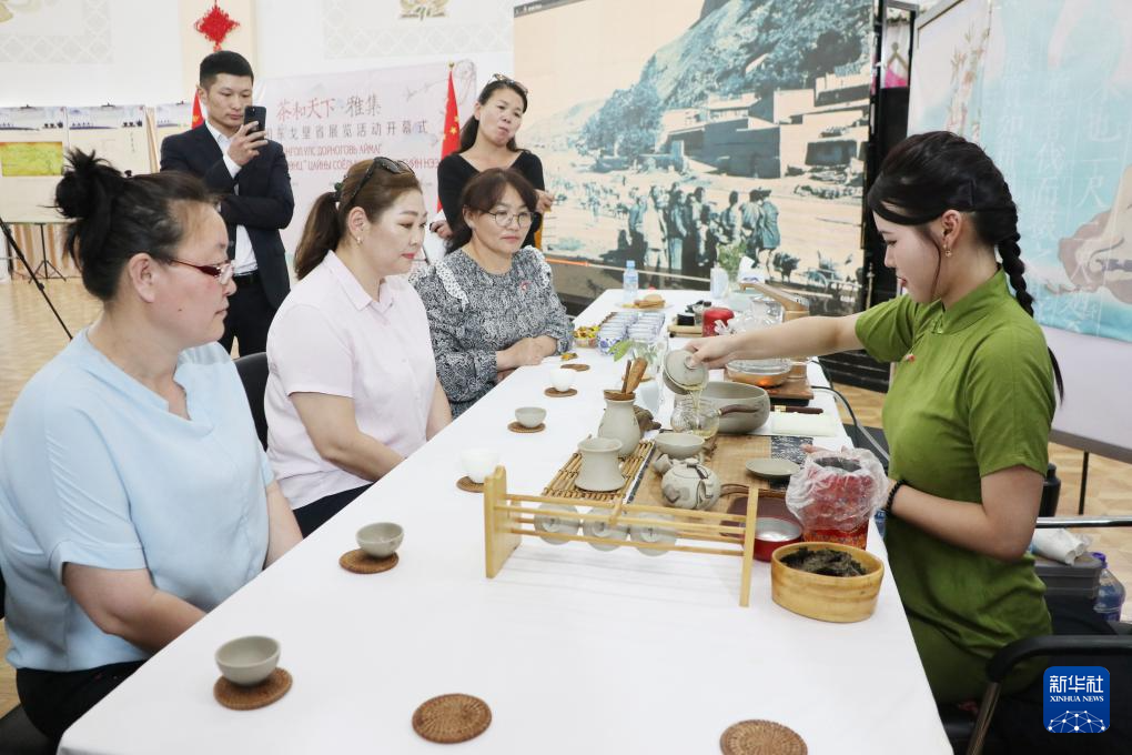 6月16日,人们在蒙古国东戈壁省赛音山达举行的“茶和天下·雅集”活动上品茶。