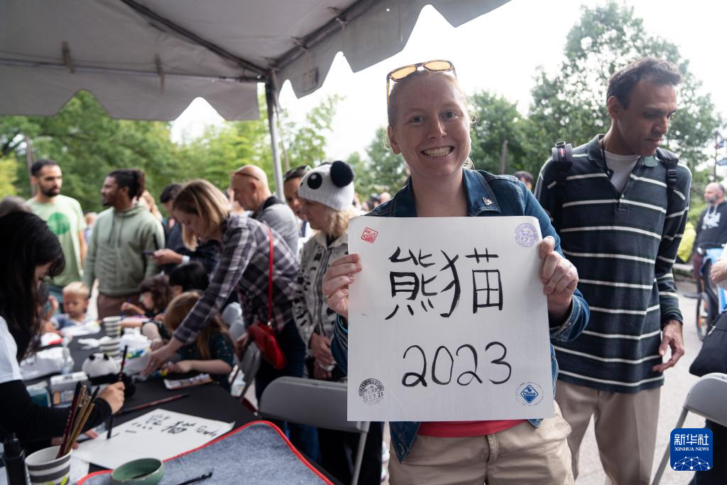 9月30日,游客在美国华盛顿史密森学会国家动物园参加大熊猫主题书法活动。美国史密森学会国家动物园为“美香”“添添”和“小奇迹”三只旅美大熊猫举办为期九天的欢送活动,内容包括制作大熊猫主题手工艺品、放映电影《功夫熊猫》、学写汉字、品尝中式美食等。
