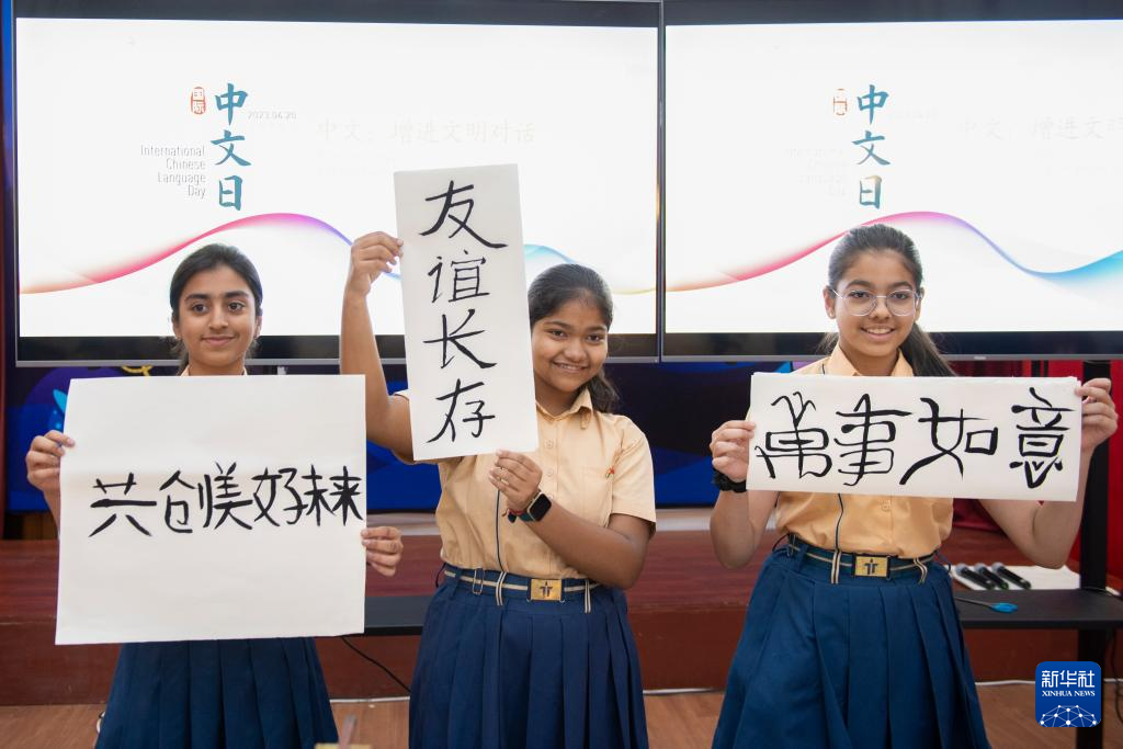 4月20日,印度青少年在位于新德里的中国驻印度大使馆参加天宫对话——神舟十五号航天员乘组与上海合作组织国家青少年问答活动时展示书写的中文。