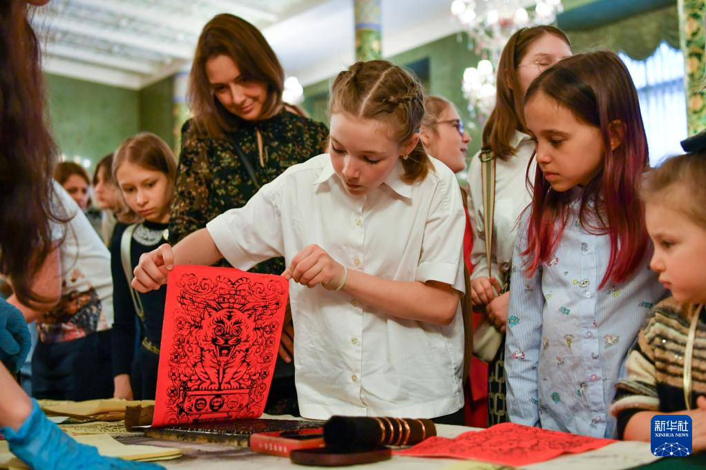 6月2日,在位于俄罗斯莫斯科的中国驻俄罗斯大使馆举行的一场中国传统文化体验活动上,一名小朋友体验雕版印刷。