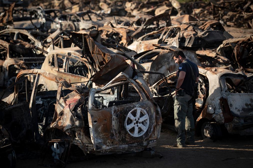 11月6日,在以色列南部城市内提沃特附近,一名男子站在汽车残骸旁。新华社记者陈君清摄