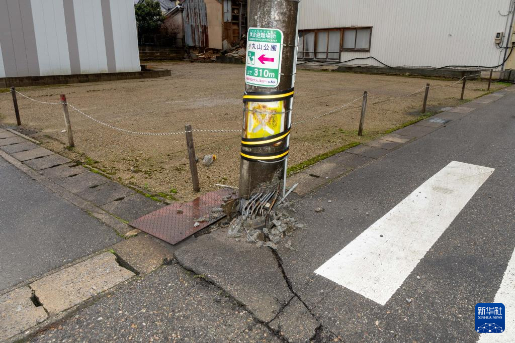 这是1月3日在日本石川县七尾市拍摄的一处因地震受损的电线杆。