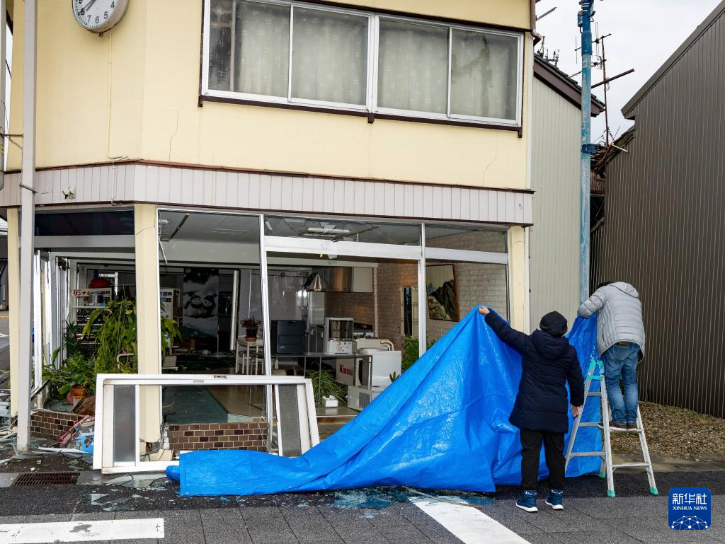 1月3日,市民在日本石川县七尾市准备用蓝布遮住一处因地震受损的房屋。