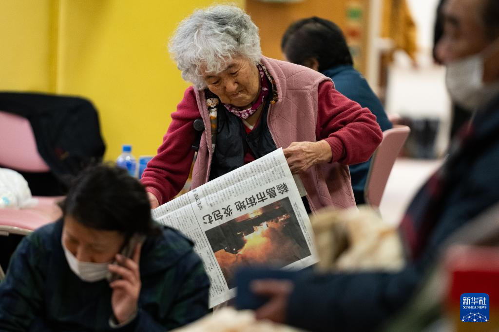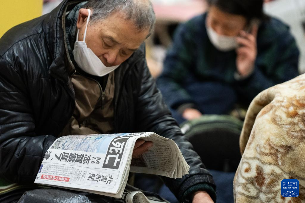 1月3日,在日本石川县轮岛市一处容纳超700人的临时避难所内,一名老人阅读报纸上的地震报道。