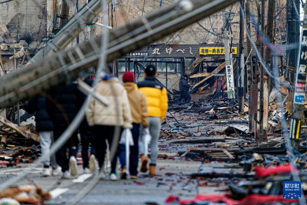 在日本石川县轮岛市,市民们查看“轮岛早市”被地震引发的大火烧毁的废墟(1月4日摄)。