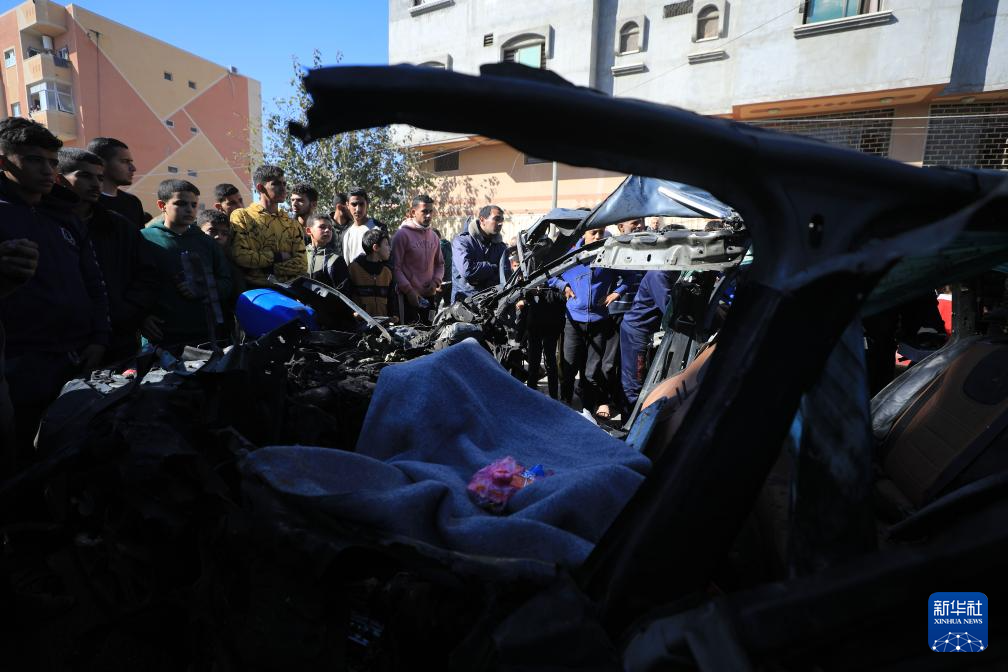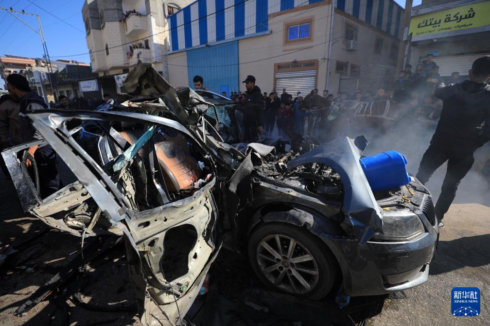 1月7日,在加沙地带南部城市拉法,人们查看被以军袭击后的受损车辆。
